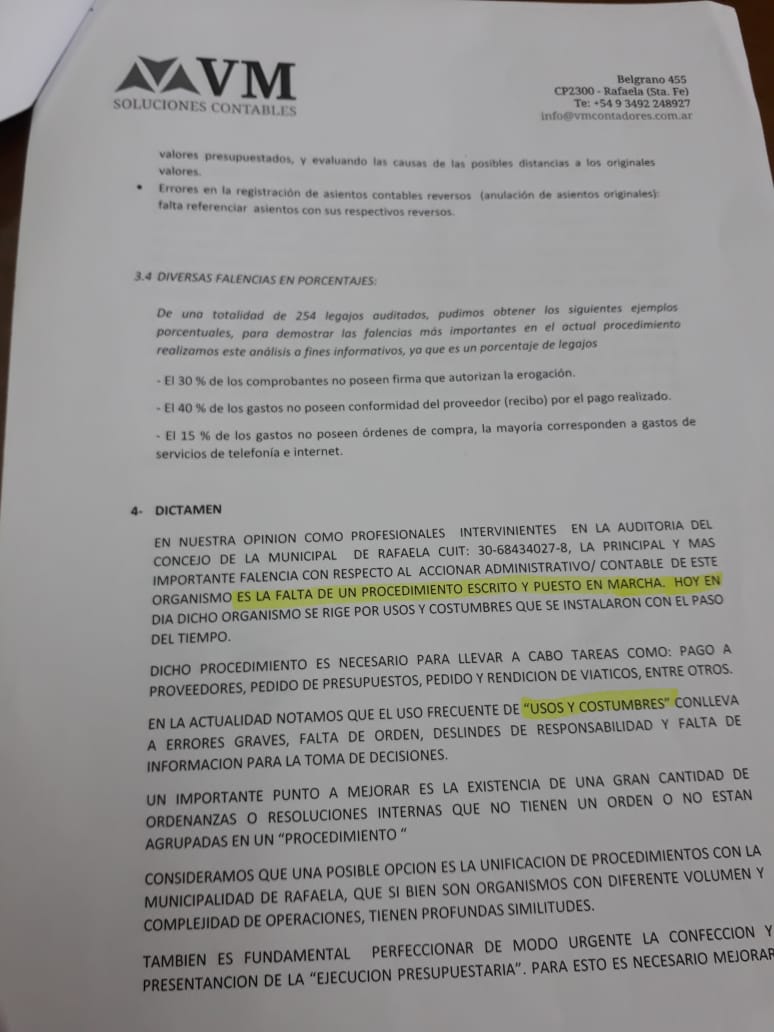 Hay problemas en la correlatividad entre el dinero que se saca y lo que se rinde en el banco, retiro informal de cheques, falta de criterio en la utilización de viático por parte de ciertos ediles. Del análisis de 254 legajos, el 40% de los gastos no tienen recibos”, explicó Vimo, entre otras cosas