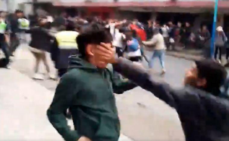 Lo que comenzó como rivalidad entre las instituciones educativas —existe una denuncia policial de la mamá de un estudiante, que habría sufrido hostigamiento— escaló rápidamente cuando, en plena calle y con la presencia de la Policía, los chicos se agarraron a piñas y patadas frente a la mirada de todos.