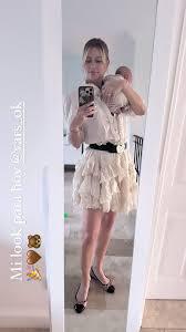 La modelo llevó un estilismo armado por una camisa en tono nude con detalles de puntillas y encaje, que combinó con una pollera mini de cintura elastizada y múltiples volados de encaje, también en color nude.