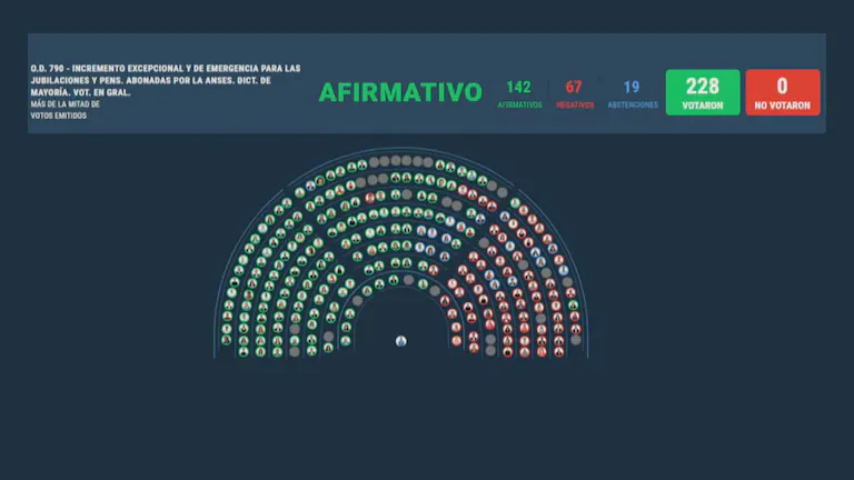 El paquete fue impulsado por un bloque opositor amplio, que incluyó desde Unión por la Patria y la izquierda, hasta sectores de la oposición dialoguista como la Coalición Cívica y Encuentro Federal. Votaron en contra La Libertad Avanza, el PRO y bloques provinciales, mientras que la UCR se abstuvo.
