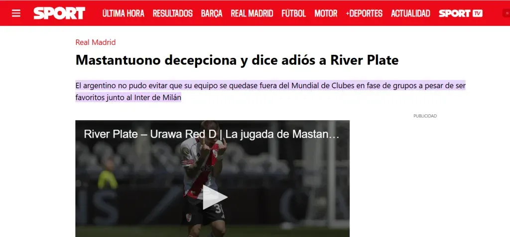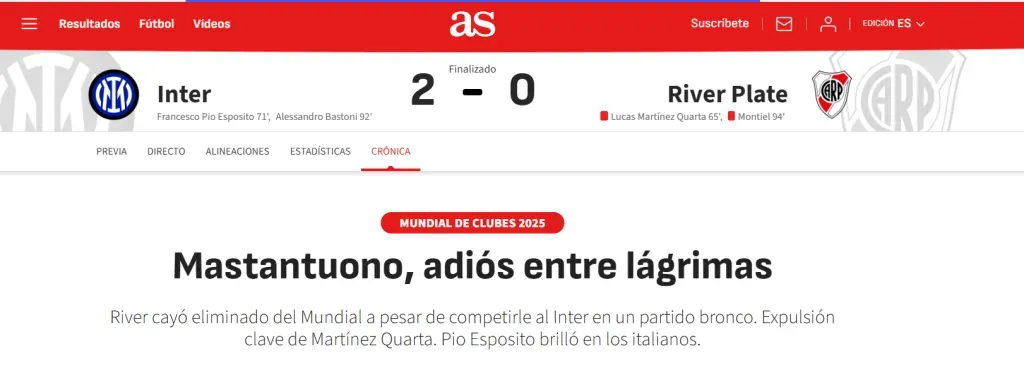 River Plate se despide del Mundial de Clubes de la FIFA tras caer frente al Inter de Milán en la ciudad de Seattle. El empate de los dirigidos por Marcelo Gallardo ante Monterrey terminó de condenarles en una zona donde los mexicanos avanzarán junto al vigente campeón de Europa. El partido disputado casi que en tierras canadienses fue visto por todo el panorama español y donde ya se empiezan a dejar reacciones alrededor del último partido de Franco Mastantuono con la banda roja.