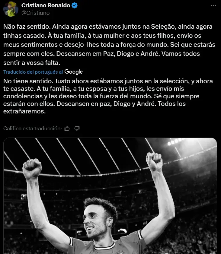 Cristiano Ronaldo fue compañero de Diogo Jota en la Selección de Portugal durante años. El máximo exponente del fútbol portugués escribió en sus redes sociales: “No tiene sentido. Justo ahora estábamos juntos en la selección, y ahora te casaste. A tu familia, a tu esposa y a tus hijos, les envío mis condolencias y les deseo toda la fuerza del mundo. Sé que siempre estarán con ellos. Descansen en paz, Diogo y André. Todos los extrañaremos”.